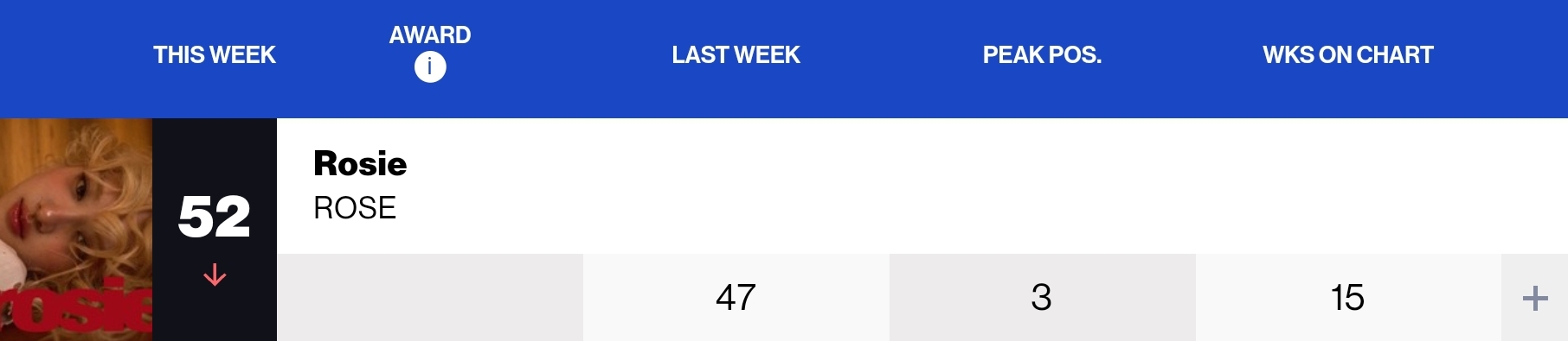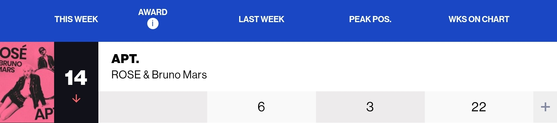 On this week’s Billboard Hot 100, the only K-POP entry is Rosé’s "APT.", which holds its position at No. 14.