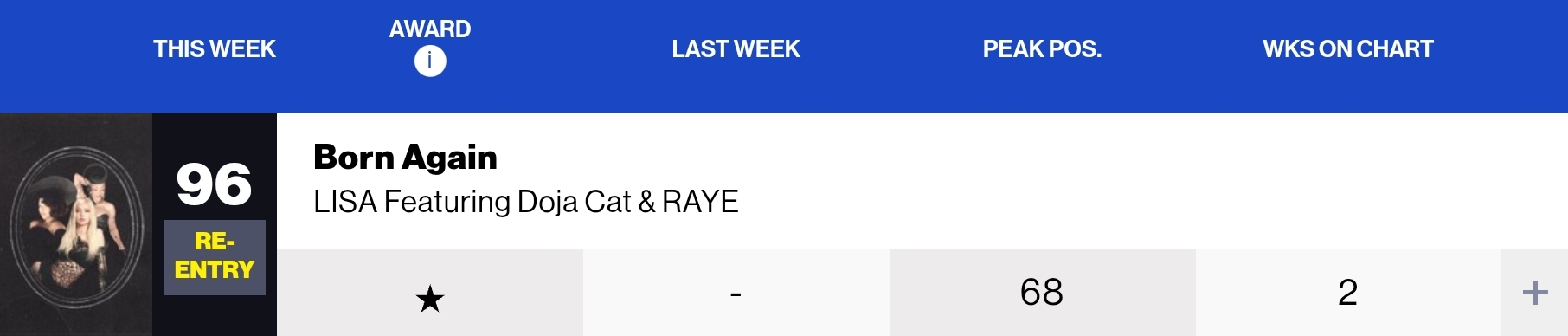 A familiar and exciting name appears on this week's chart—BLACKPINK's Lisa. Her single "Born Again" has re-entered the chart at No. 96.