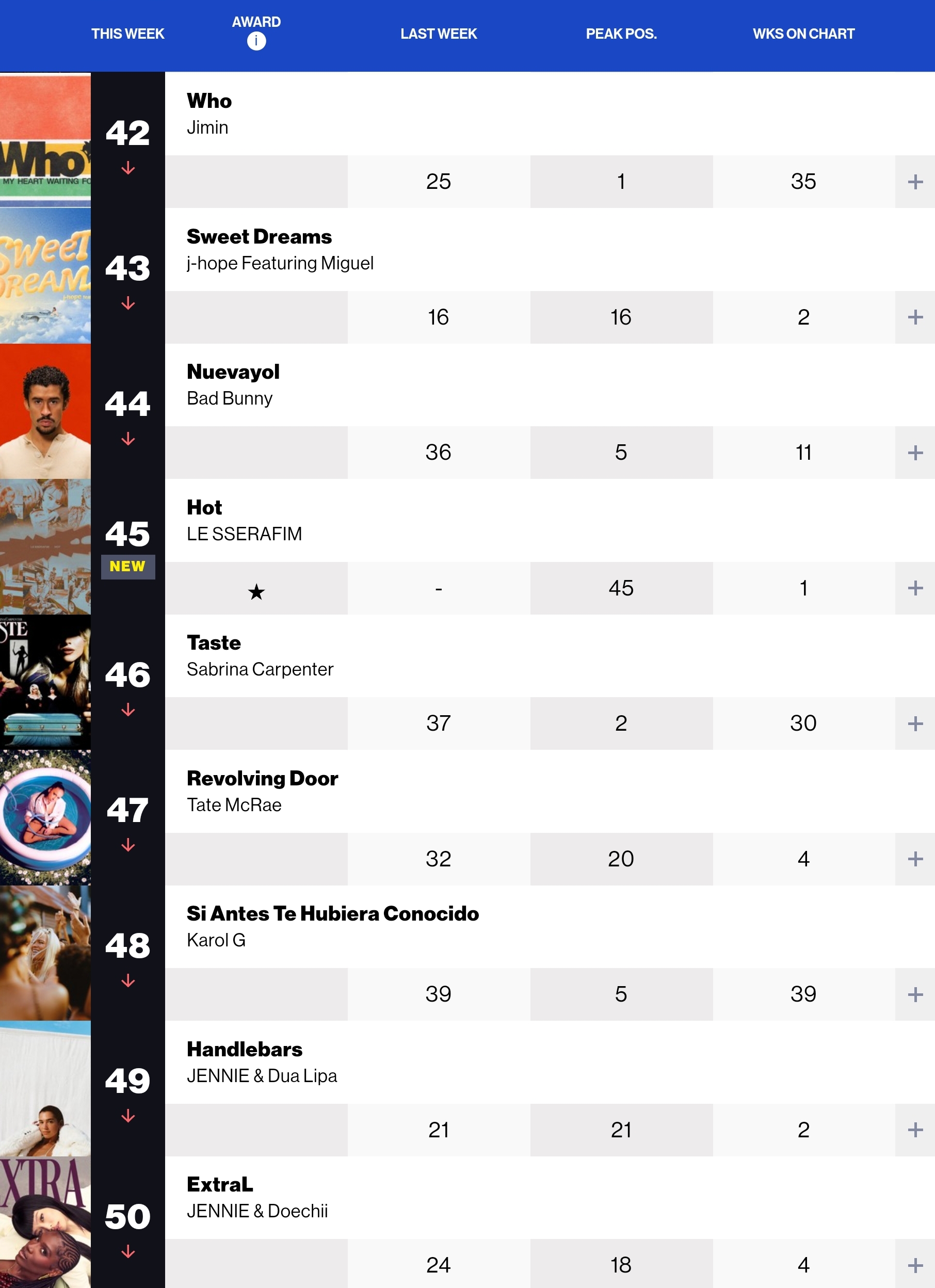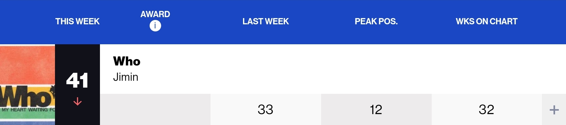 지민의 'Who'는 지난중 44위에서 이번주 33위로 껑충 뛰었습니다. 31주간 차트인중입니다. Jimin's "Who" makes a big leap from No. 44 last week to No. 33 this week, now marking its 31st week on the chart.