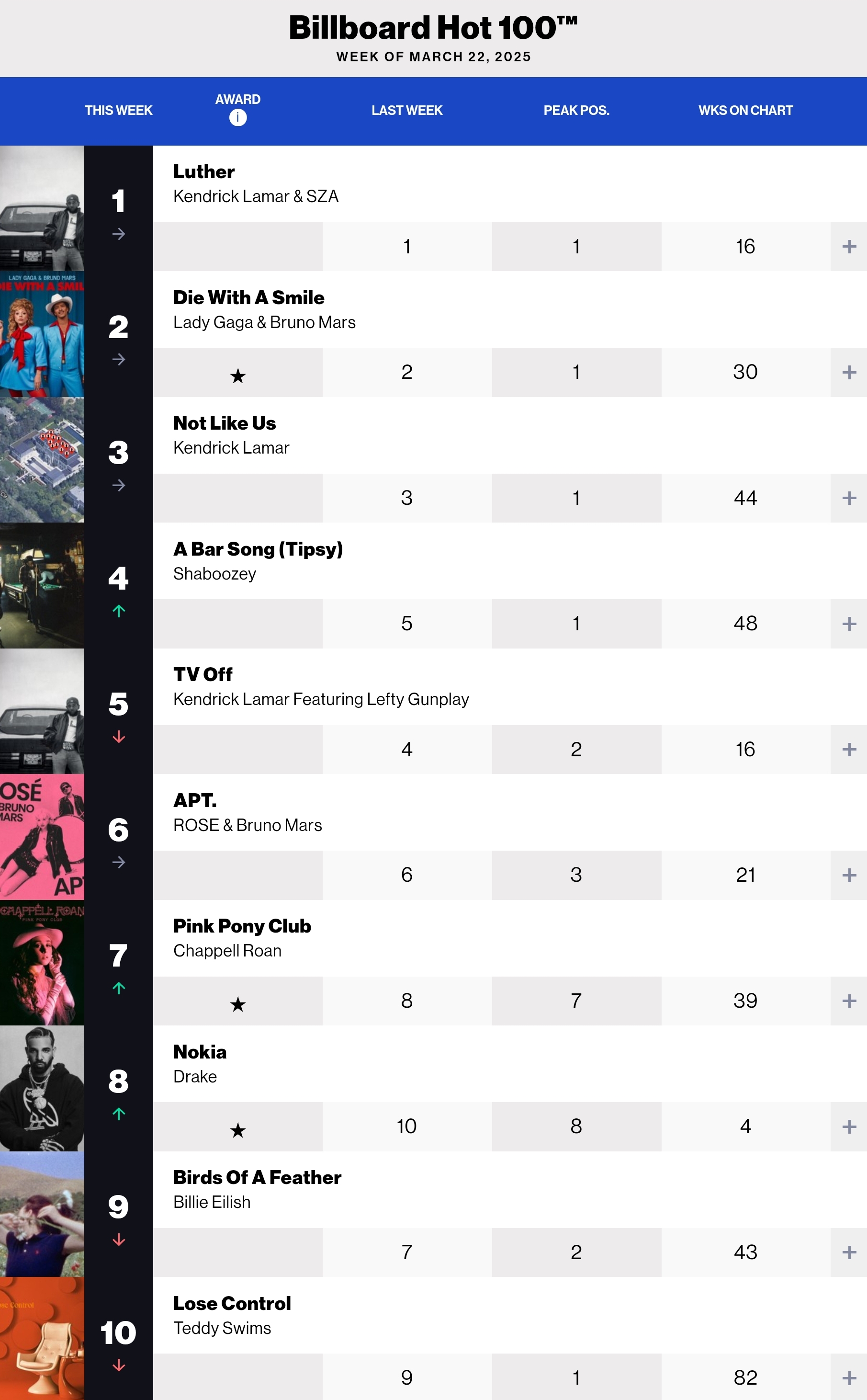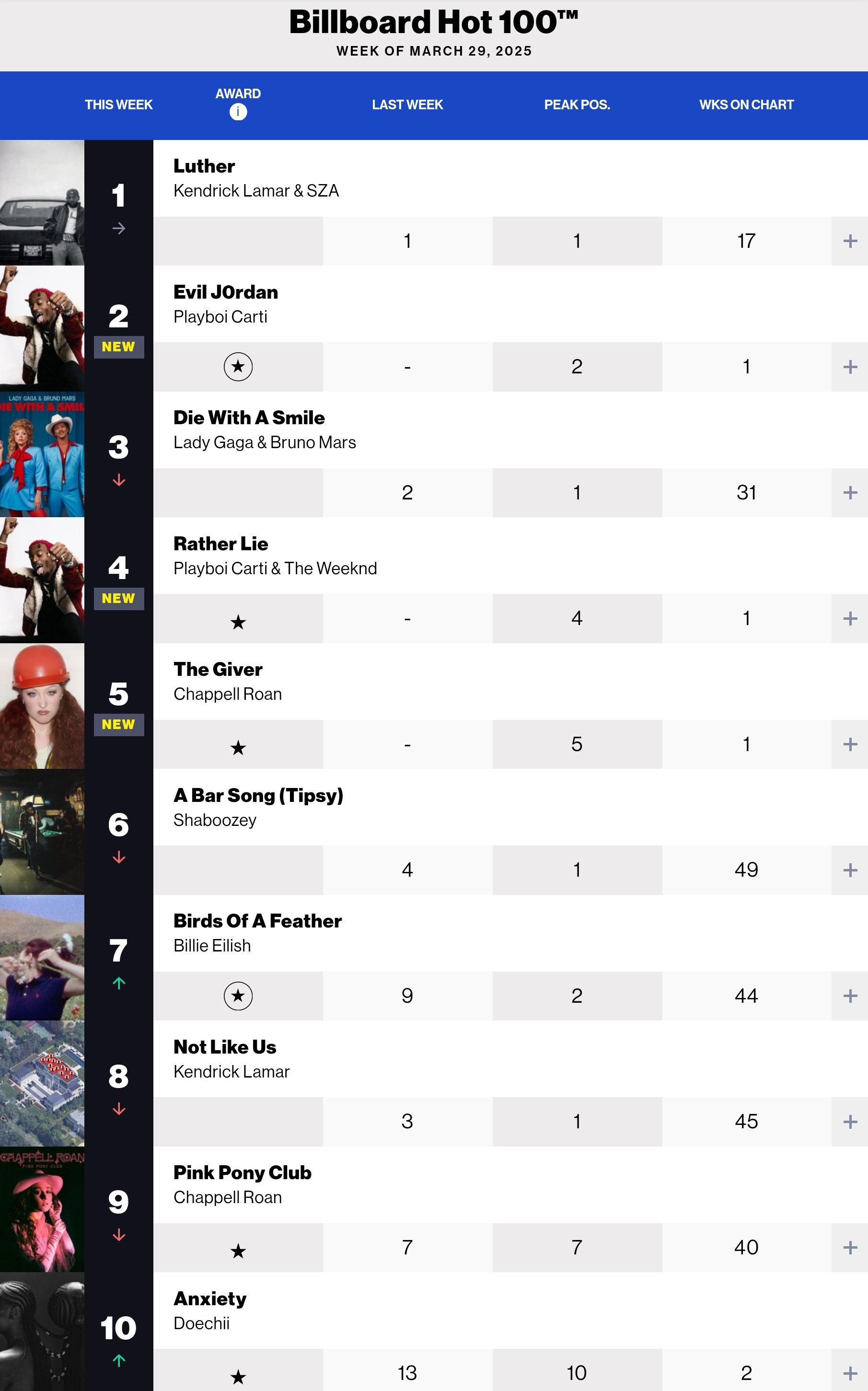 미국 내 피지컬 싱글 및 디지털 음원 판매량, 스트리밍 수치, 라디오 에어플레이 수치, 유튜브 조회수 등을 합산하여 노래의 성적을 총 망라하는 메인차트인 빌보드 핫 100 차트의 2025년 3월 22일 TOP 10입니다.