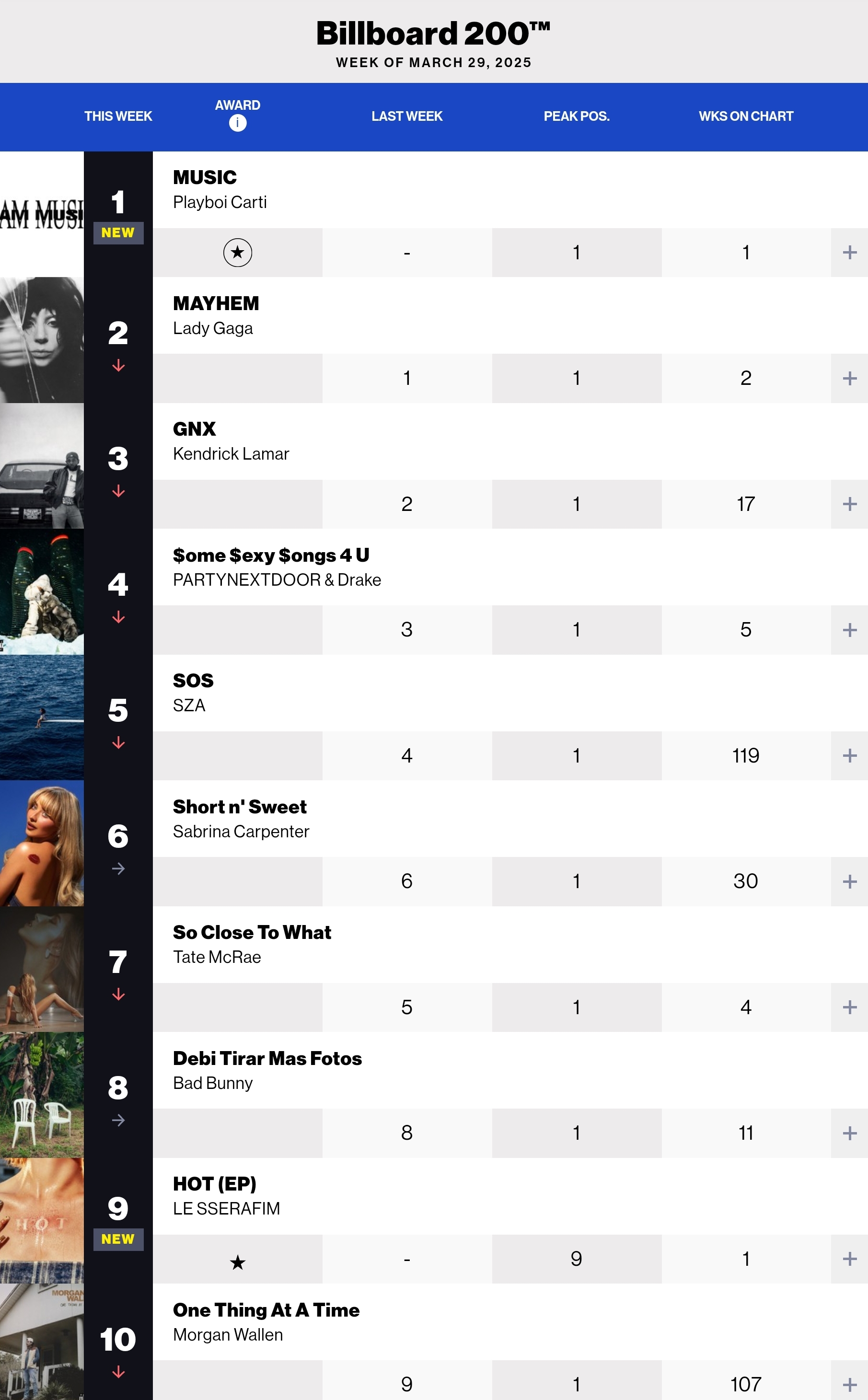 미국 내 피지컬 앨범 판매량 및 디지털 다운로드, 스트리밍 수치를 합산하여 앨범의 성적을 종합적으로 평가한 빌보드 200 차트의 2025년 3월 15일 TOP 10입니다. The Billboard 200 chart for March 15, 2025, ranks albums based on physical album sales, digital downloads, and streaming numbers in the U.S. Here are the Top 10 albums this week.