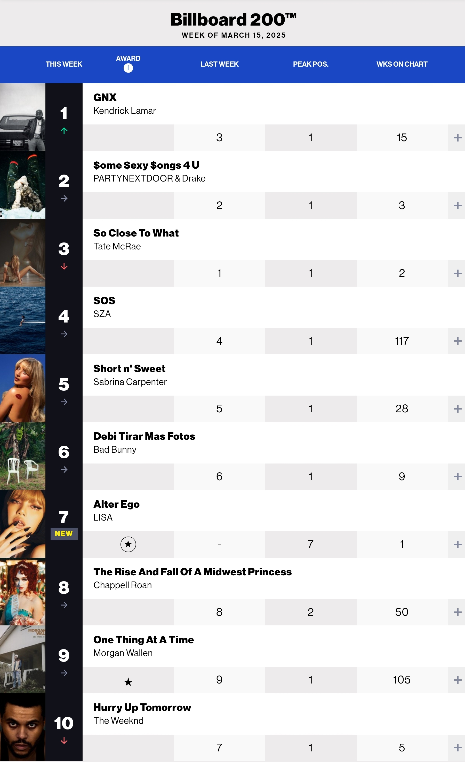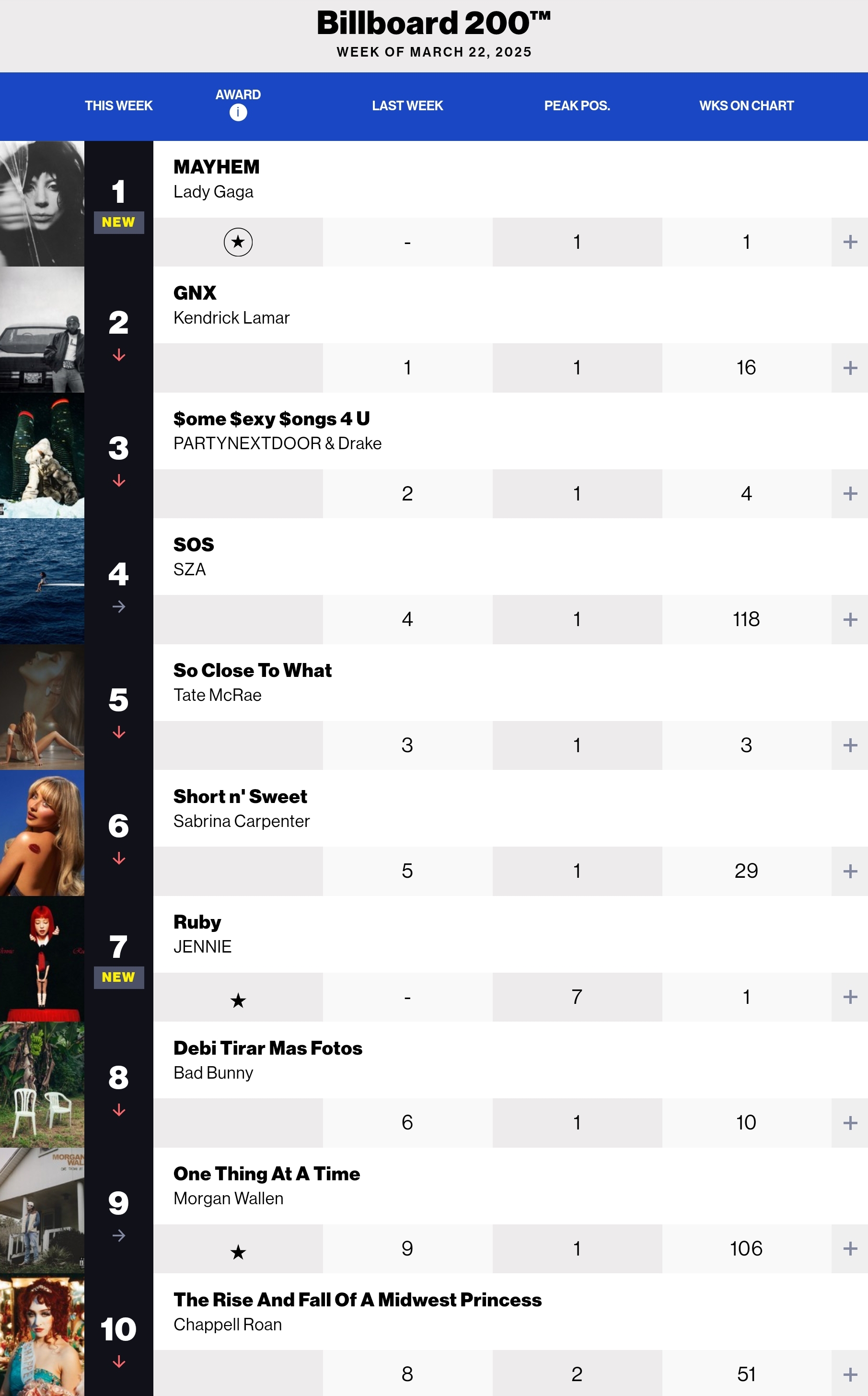 ※ 빌보드 200 차트 2025년 3월 22일 TOP 10