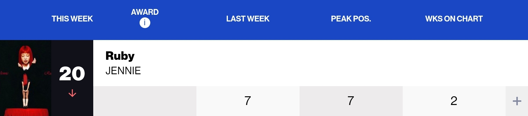 그리고 피지컬 앨범 판매 차트인 빌보드 200에도 제니의 신보 <Ruby>가 7위로 차트인을 했습니다. Additionally, her new album, Ruby, has debuted at No. 7 on the Billboard 200, which ranks albums based on physical sales and streaming performance.
