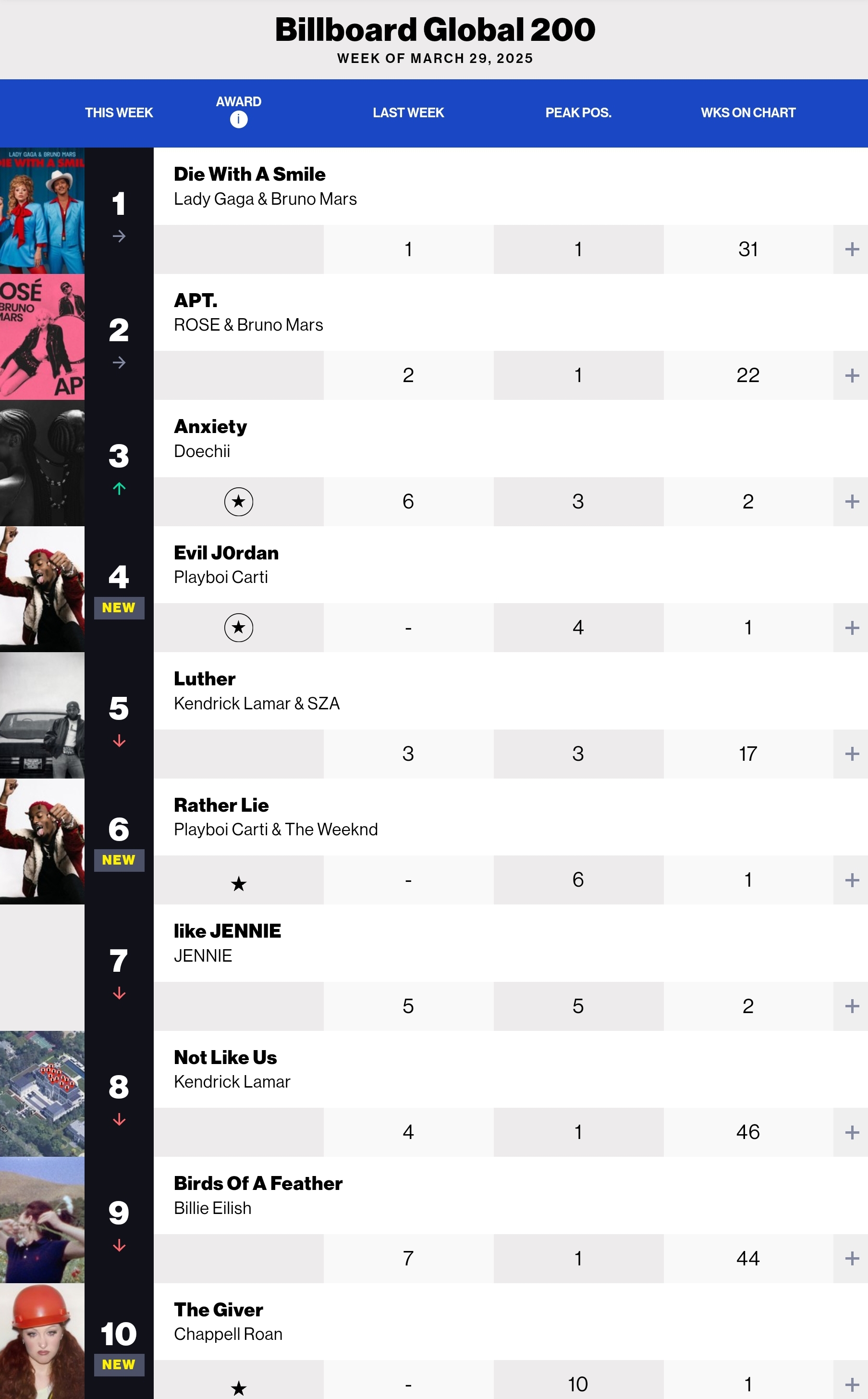 ※ 제니 빌보드 글로벌 200 차트 2025년 3월 29일 기준 순위※ 로제 빌보드 글로벌 200 차트 2025년 3월 29일 기준 순위