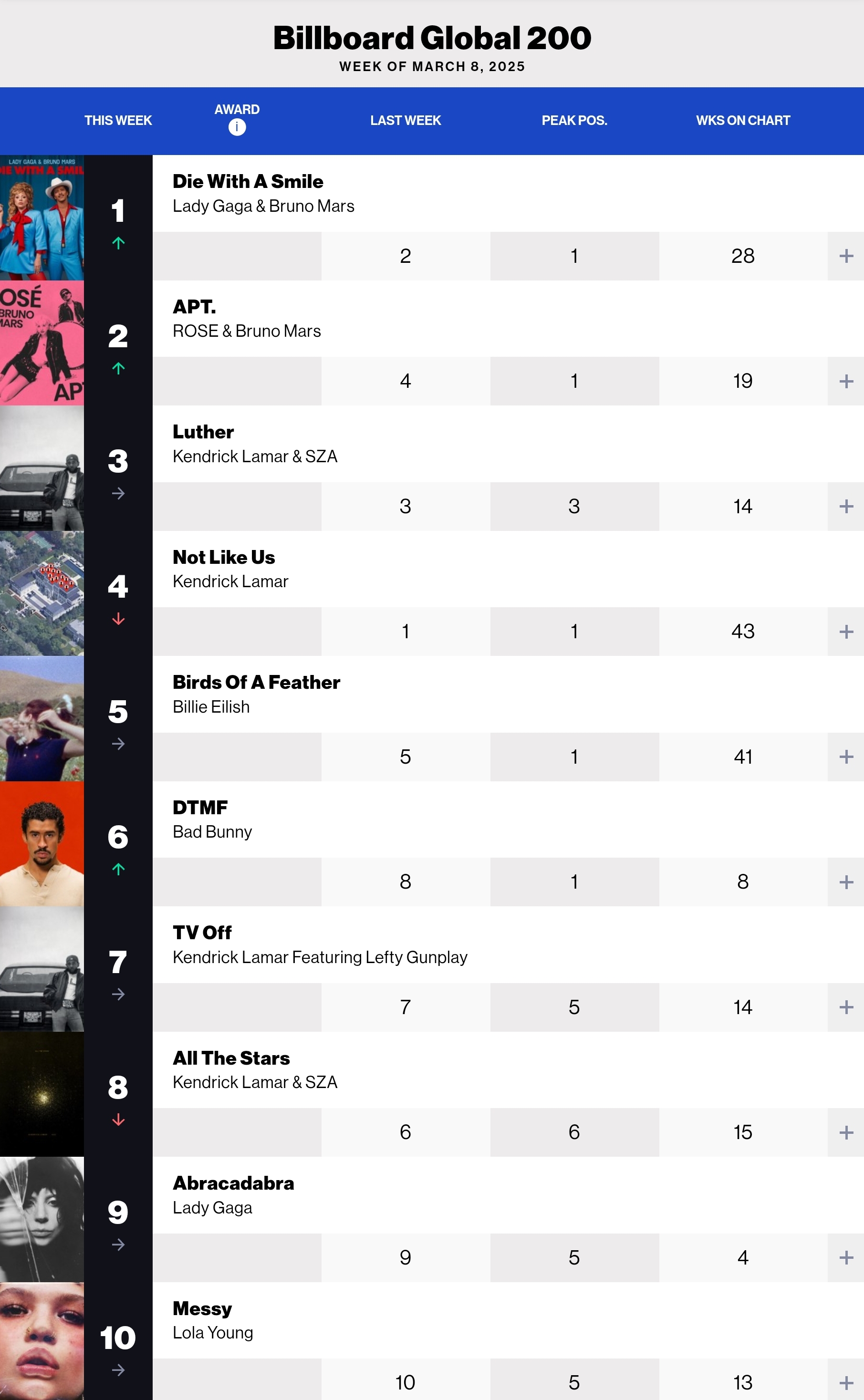 전 세계에서 발생한 스트리밍 수치와 디지털 음원 판매량을 기반으로 집계되는 빌보드 글로벌 200 차트의 2025년 3월 8일 TOP 10입니다. The Billboard Global 200 chart for March 8, 2025, ranks songs based on streaming numbers and digital sales worldwide. Here are the Top 10 songs this week.