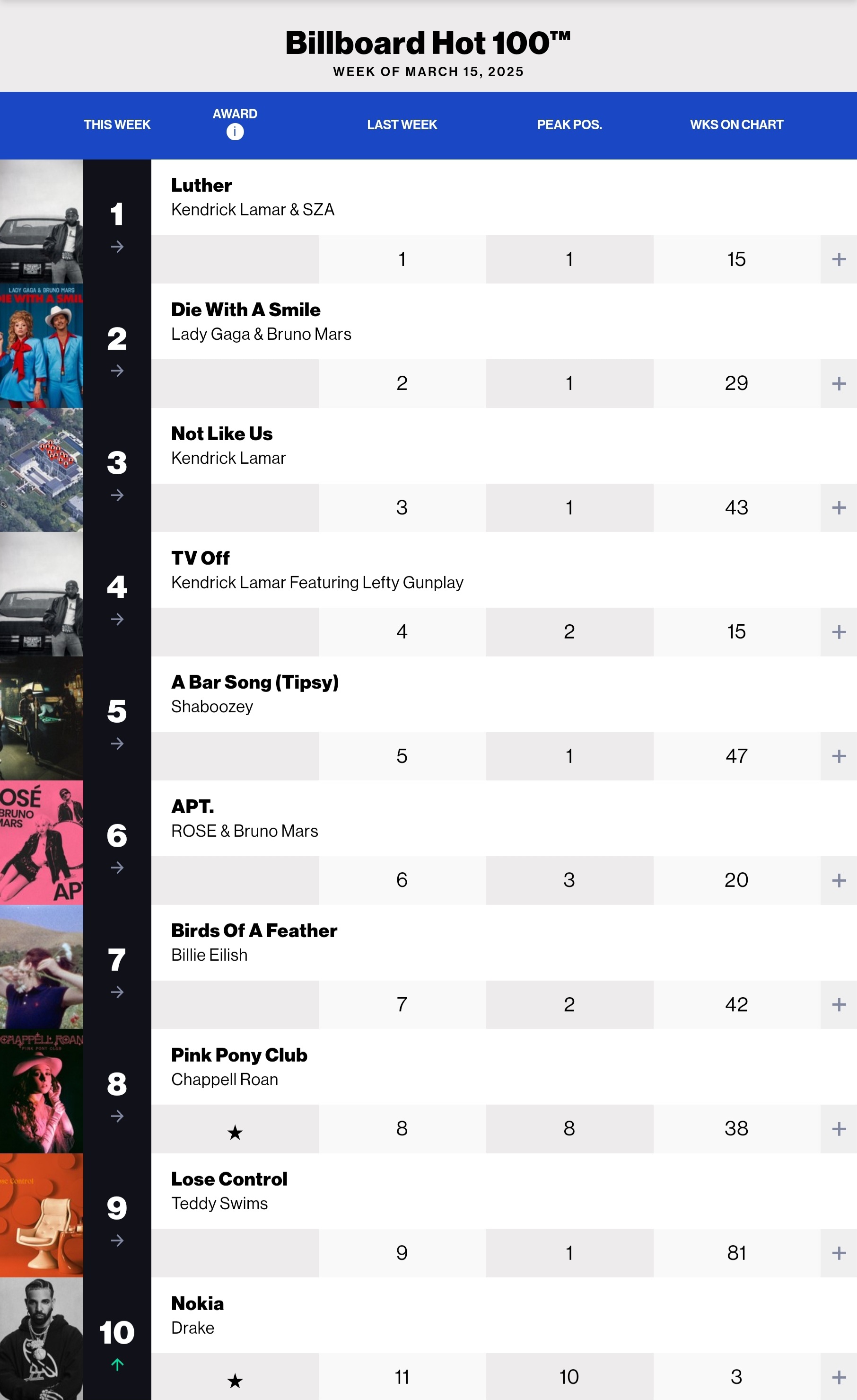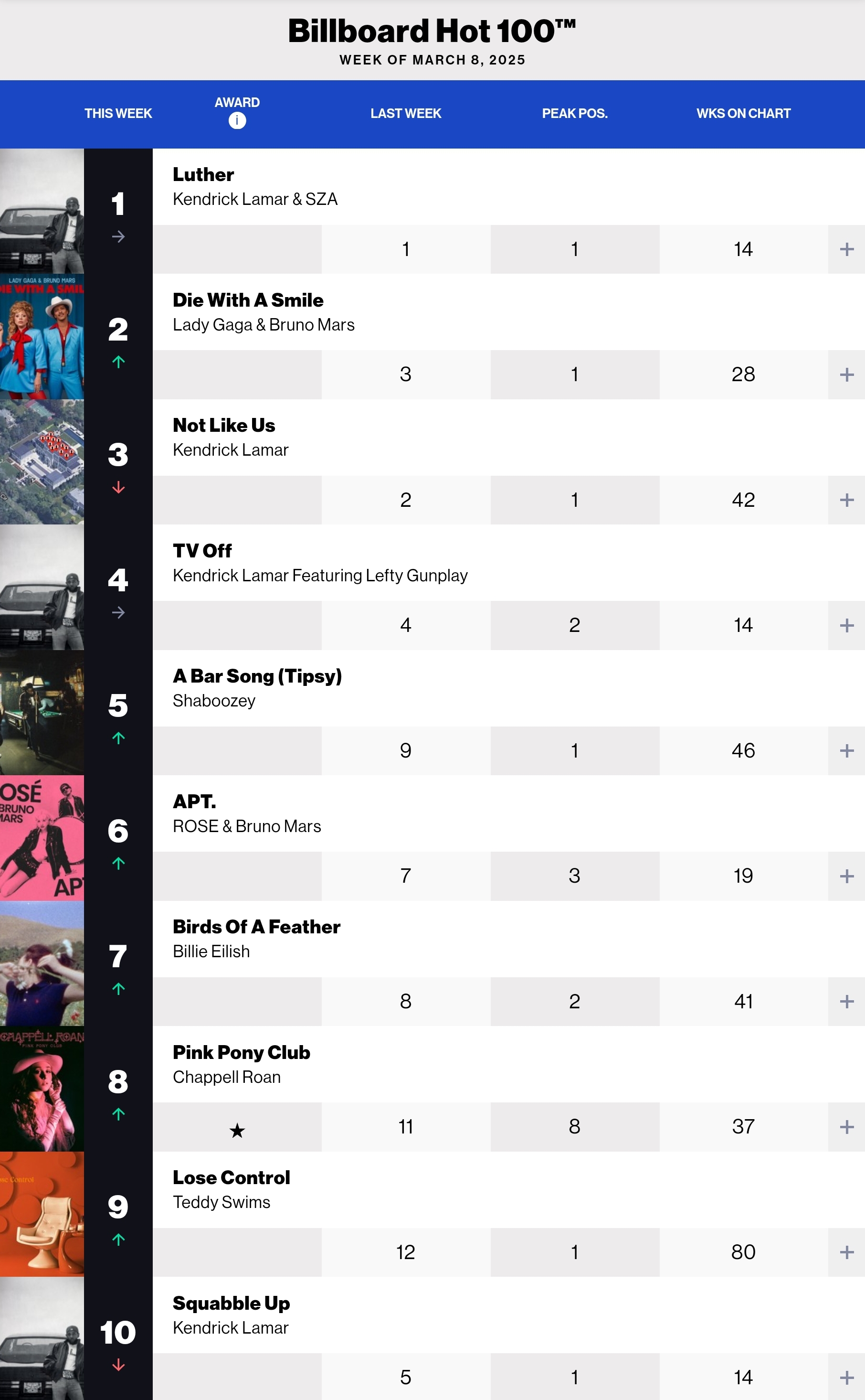 미국 내 피지컬 싱글 및 디지털 음원 판매량, 스트리밍 수치, 라디오 에어플레이 수치, 유튜브 조회수 등을 합산하여 노래의 성적을 총 망라하는 메인차트인 빌보드 핫 100 차트의 2025년 3월 8일 TOP 10입니다.