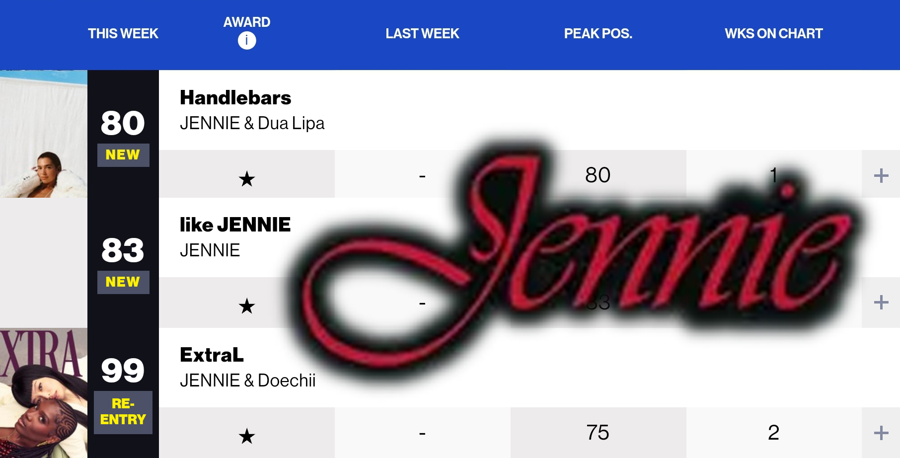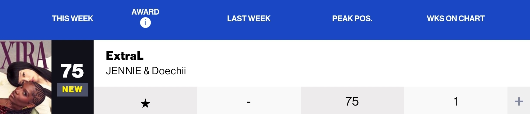 Jennie’s new single "ExtraL" has entered the chart at No. 75. With this, all pre-release tracks from her first full solo album, <Ruby> 'Mantra' and 'Love Hangover' have successfully entered the Billboard Hot 100.