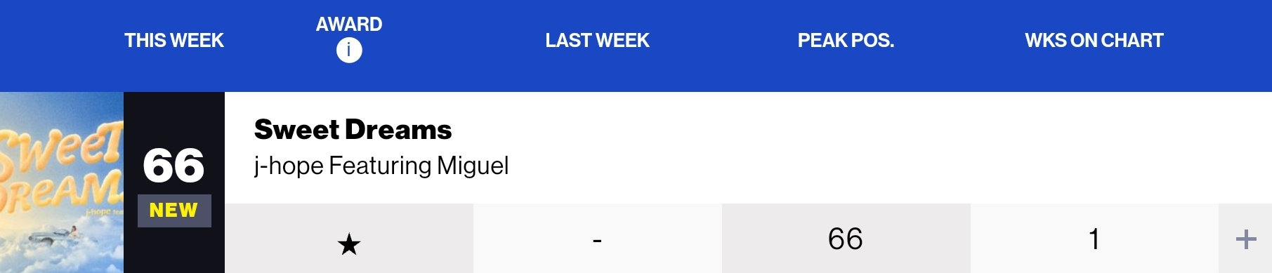 그리고 같은 팀인 제이홉(J-Hope)은 제대하자마자 발표한 신곡인 'Sweet Dreams'가 66위로 차트인을 했습니다. J-Hope, from the same group, has debuted at No. 66 on the Billboard Hot 100 with his newly released song "Sweet Dreams," marking his first comeback after completing military service.