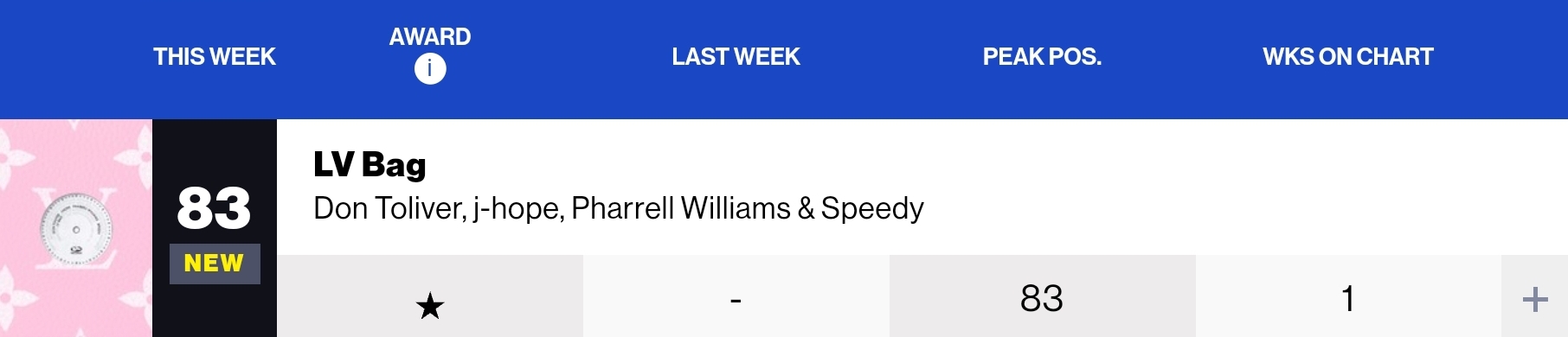 BTS member j-hope also appears on the chart at No. 83. "LV BAG" by Don Toliver, featuring j-hope, debuts at No. 83 on the chart.