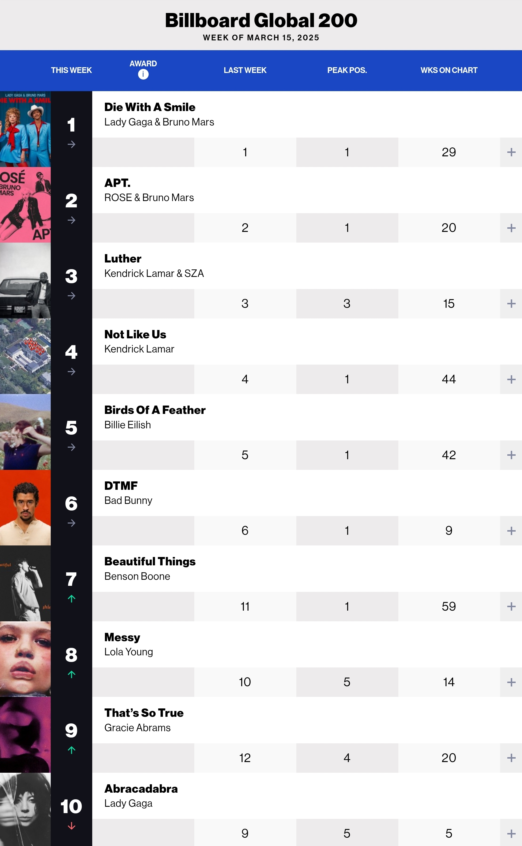 The Billboard Global 200 chart for March 22, 2025, ranks songs based on streaming numbers and digital sales worldwide. Here are the Top 10 songs this week.