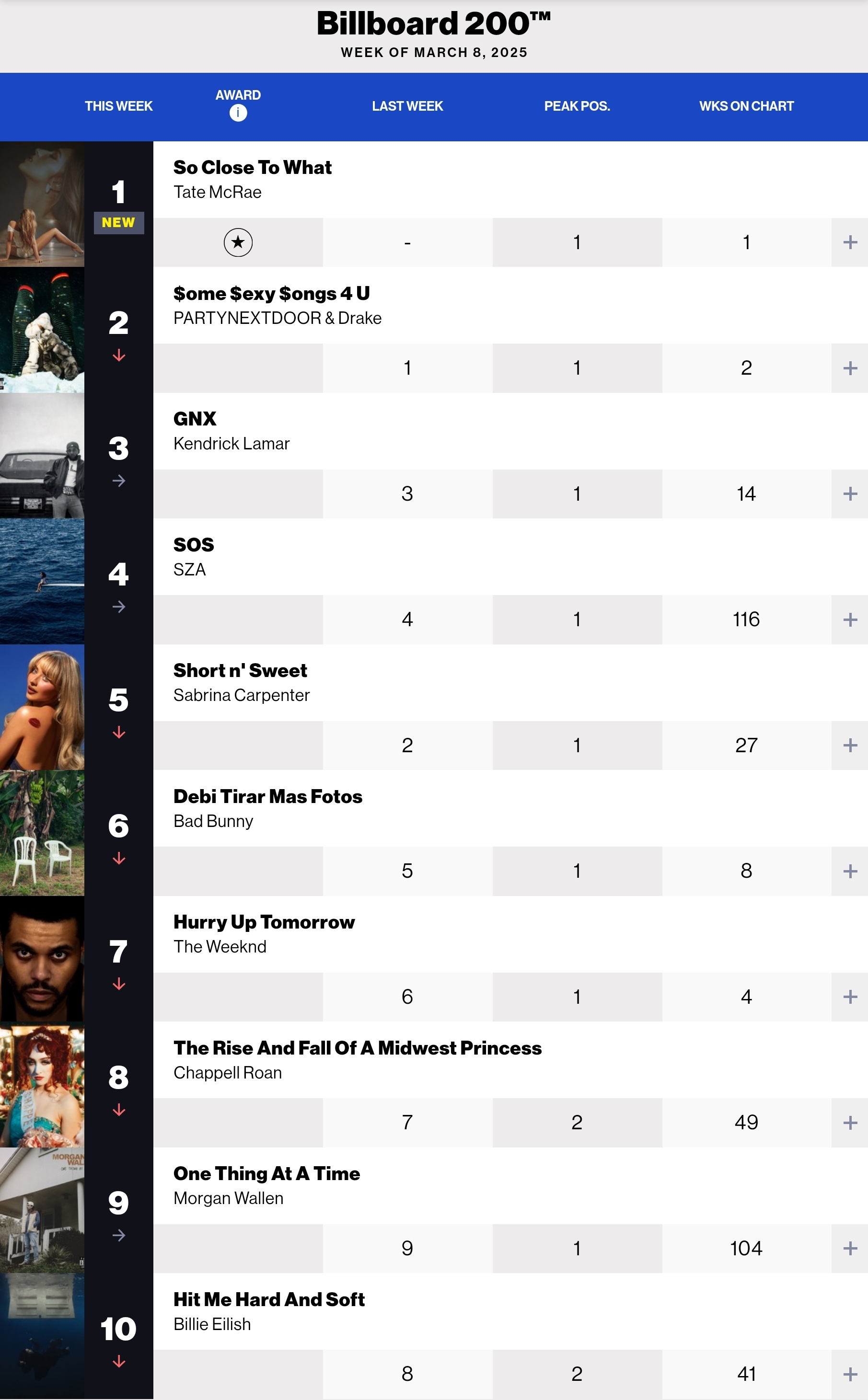 미국 내 피지컬 앨범 판매량 및 디지털 다운로드, 스트리밍 수치를 합산하여 앨범의 성적을 종합적으로 평가한 빌보드 200 차트의 2025년 3월 8일 TOP 10입니다. The Billboard 200 chart for March 8, 2025, ranks albums based on physical sales, digital downloads, and streaming numbers in the U.S. Here are the Top 10 albums this week.