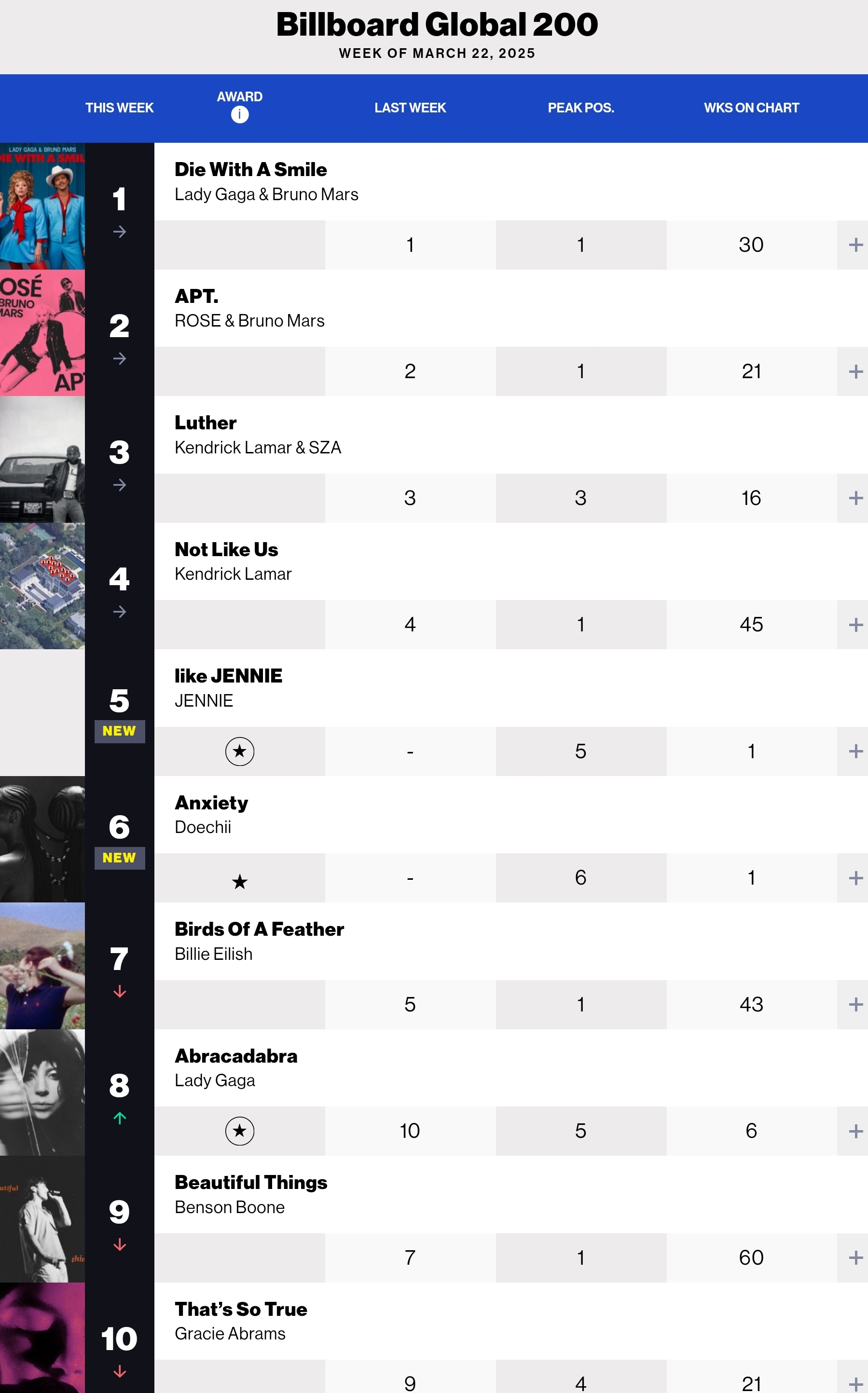 전 세계에서 발생한 스트리밍 수치와 디지털 음원 판매량을 기반으로 집계되는 빌보드 글로벌 200 차트의 2025년 3월 29일 TOP 10입니다. The Billboard Global 200 chart for March 29, 2025, ranks songs based on streaming numbers and digital sales worldwide. Here are the Top 10 songs this week.